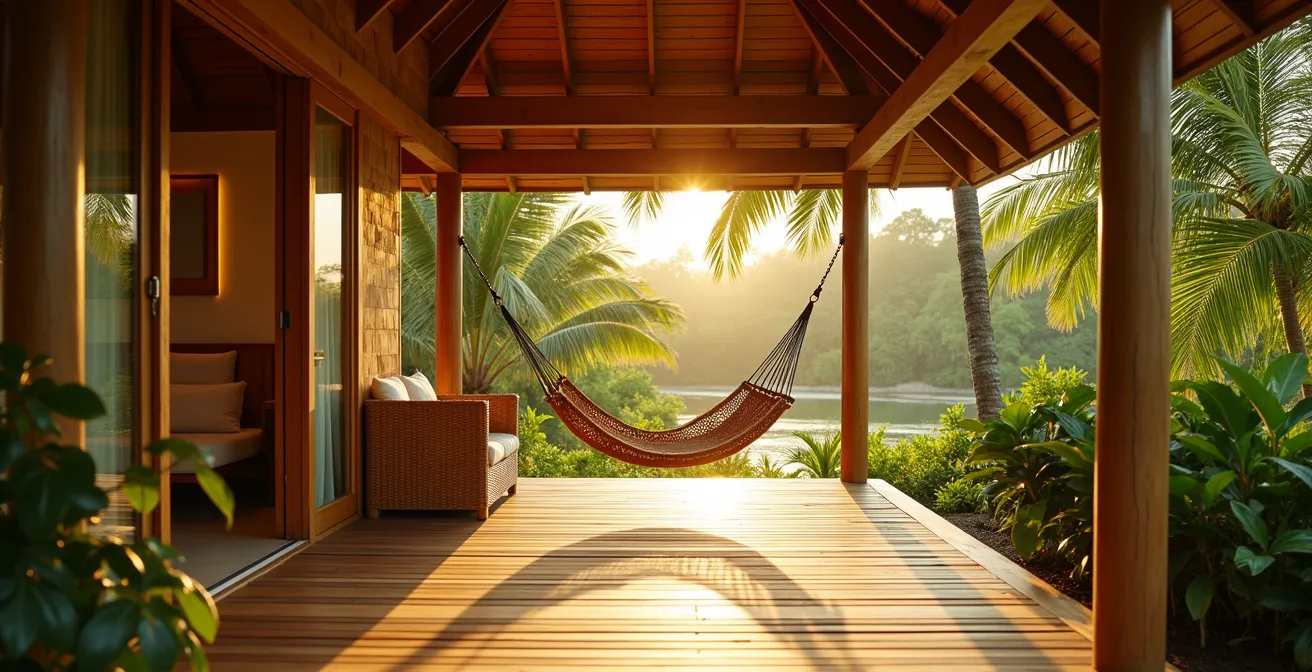 Si l’appartement climatisé est centré sur l’intérieur, le bungalow tropical, lui, s’organise autour de sa terrasse, ou « galerie » en créole. Cet espace n’est pas un simple ajout, c’est le cœur battant de la maison, la pièce où l’on vit, mange et se repose. Son rôle central est le fruit d’une conception bioclimatique qui vise à maximiser le confort hygrothermique sans aucune technologie active. La galerie est une machine à ventiler, un espace tampon qui protège de la pluie et du soleil tout en invitant la nature à l’intérieur. C’est là que la collaboration avec le climat atteint son apogée.